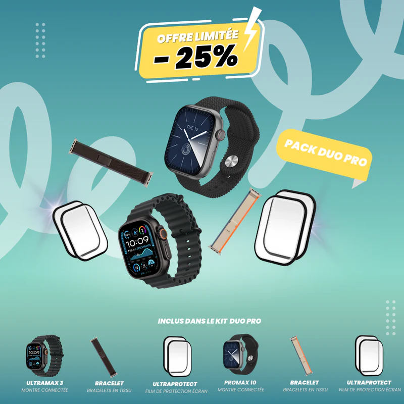 Le pack comprend 2 montres de votre choix, un bracelet gris en tissu pour une ULTRAMAX 3 et un bracelet blanc en tissu pour une PROMAX 10 ainsi qu’un film de protection ULTRAPROTECT par montre.